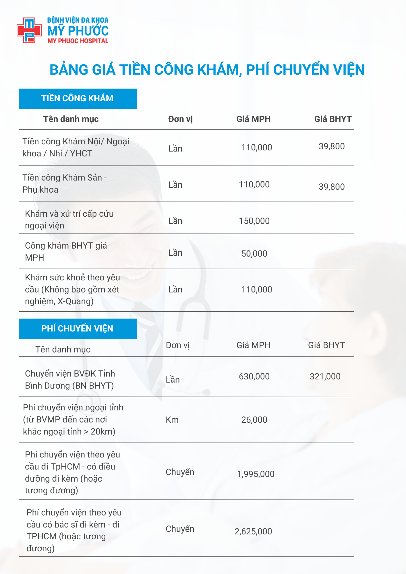 Nhằm mang đến sự minh bạch, rõ ràng và thuận tiện cho người bệnh trong quá trình khám, chữa bệnh, Bệnh viện Đa khoa Mỹ Phước (MPH) xin thông tin bảng giá tiền công khám và phí chuyển viện hiện đang áp dụng tại bệnh viện.
