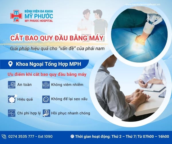 Tại bệnh viện Đa khoa Mỹ Phước, kỹ thuật cắt bao quy đầu bằng máy được thực hiện bởi đội ngũ Bác sĩ Ngoại khoa giàu kinh nghiệm, trong phòng mổ vô khuẩn tuyệt đối, đảm bảo an toàn và hồi phục nhanh.