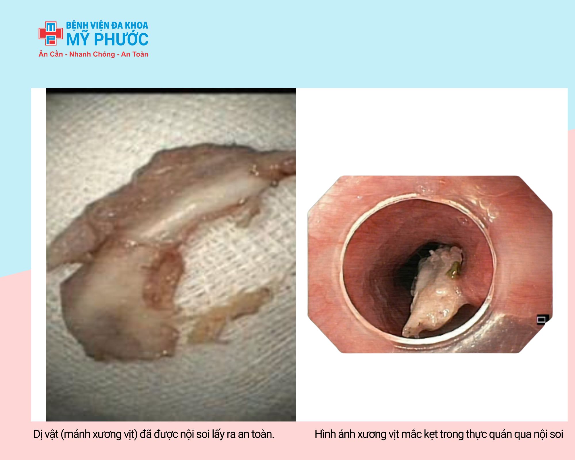 Người bệnh Nam, 36 tuổi đến khám tại Bệnh viện đa khoa Mỹ Phước vì nuốt vướng và đau ngực sau bữa ăn cùng gia đình. Bác sĩ Phạm Hữu Tuân - Trưởng khoa Chẩn đoán hình ảnh & Thăm dò chức năng đã trực tiếp nội soi, phát hiện mảnh xương vịt (~1.5 x 2.5 cm) mắc kẹt 1/3 trên thực quản và đã lấy dị vật an toàn ngay trong quá trình nội soi.