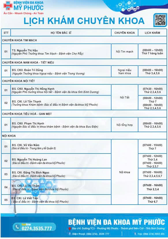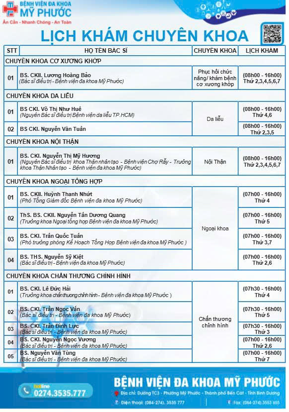 Tuần 4 (Từ ngày 23-02-2026 đến 28-02-2026) Quý khách có nhu cầu tìm hiểu thêm về lịch khám bệnh chuyên khoa tại Bệnh viện Đa khoa Mỹ Phước, vui lòng liên hệ ngay để được hỗ trợ chi tiết nhất: 📞 Hotline: 0274 353 5777 👉 Nhấn phím 1090 để gặp nhân viên tư vấn. 💬 Hoặc inbox trực tiếp để nhận phản hồi nhanh chóng và sớm nhất! Chúng tôi luôn sẵn sàng hỗ trợ quý khách với sự tận tâm và chu đáo nhất! 💙
