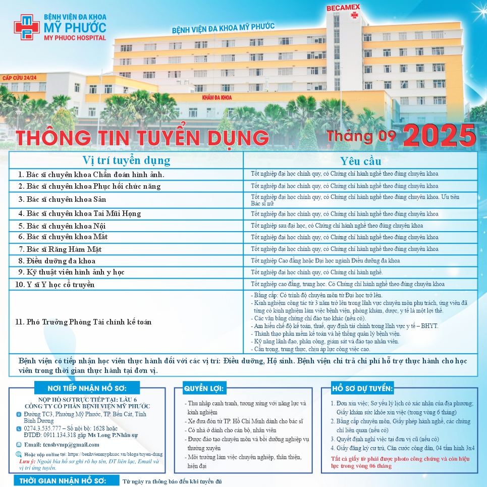 Bệnh Viện Đa Khoa Mỹ Phước đang tuyển dụng nhân sự tháng 09/2025 với nhiều vị trí hấp dẫn. Nếu bạn đang tìm kiếm cơ hội làm việc trong môi trường chuyên nghiệp, hãy nộp CV ứng tuyển ngay nhé!