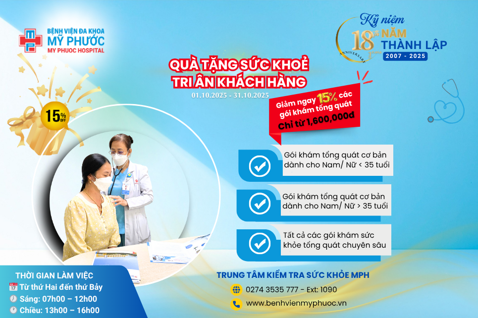 Nhân dịp Kỷ niệm 18 năm thành lập Bệnh viện Đa khoa Mỹ Phước (2007 – 2025), Trung tâm Kiểm tra Sức khỏe MPH trân trọng dành tặng Quý khách hàng chương trình ưu đãi đặc biệt: